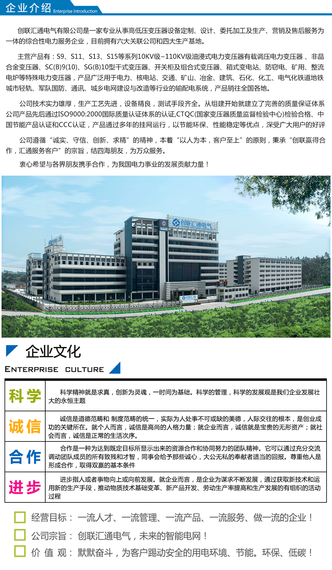 答 創聯匯通主營產品有:S11(13)、S20(22)新能效及SH15系列10KV級~110KV級油浸式電力變壓器、有載調壓電力變壓器、非晶合金變壓器、SC(B)10 (13)、SG(B)10(13)及SC(B)14(18)新能效系列干式變壓器、開關柜及組合式變壓器、箱式變電站及防竊電、礦用、整流、電爐等特殊電力變壓器。產品廣泛用于電力、核電站、交通、礦山、冶金、建...
